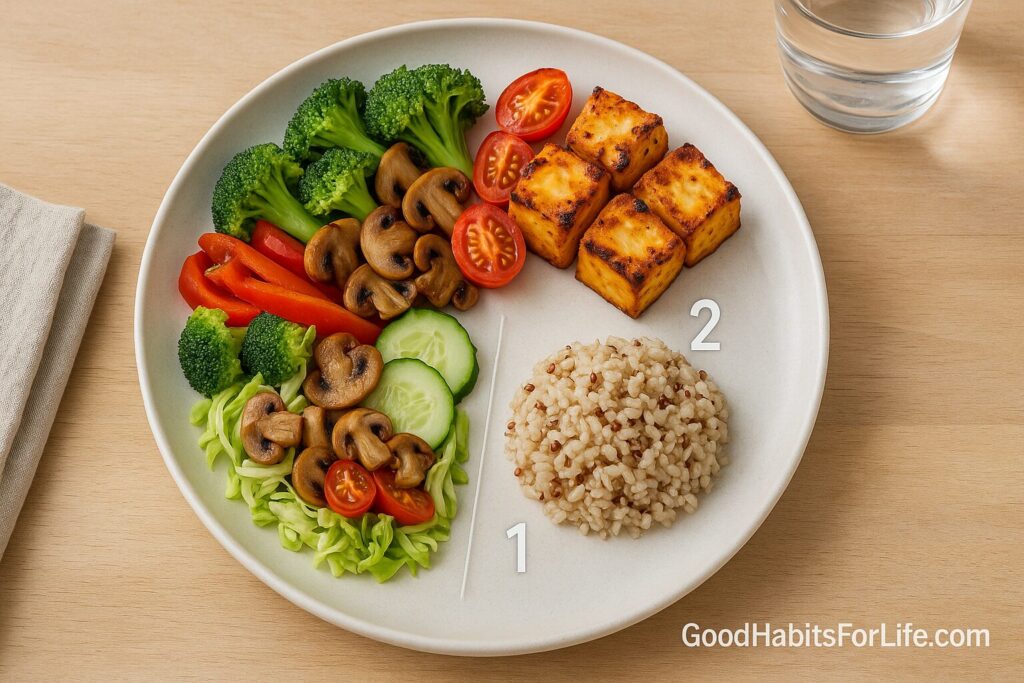 Add protein (2): Fill ~⅓ plate with lean protein (120–200 g cooked fish/chicken/tofu/tempeh, or 1–1½ cups beans/lentils).