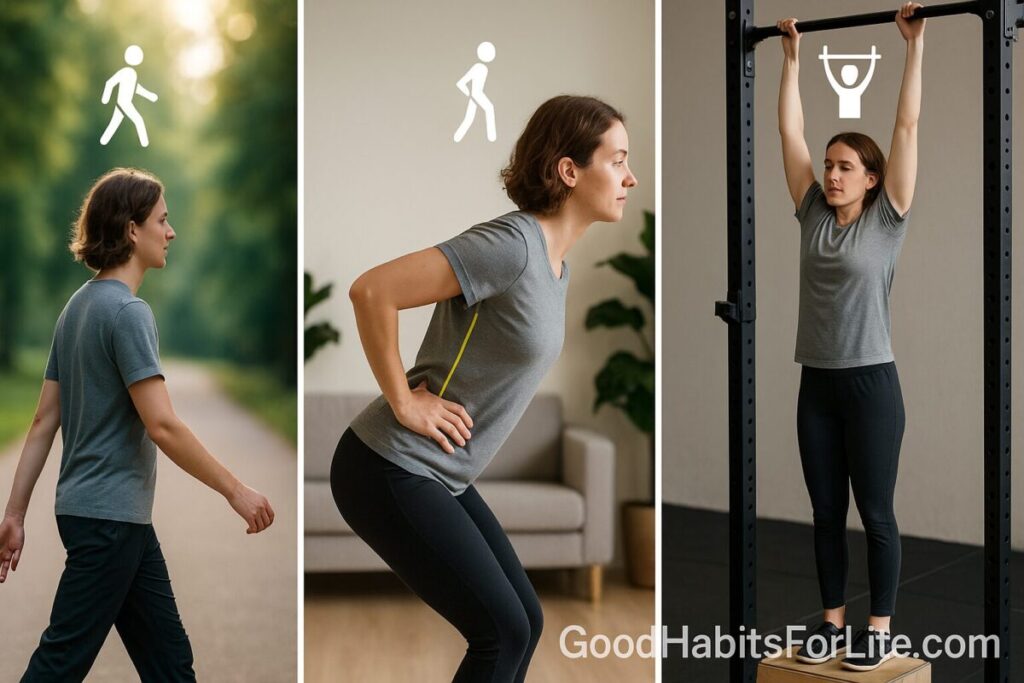 Start today: 10–20-minute walk + 3 × 5 hip hinges.