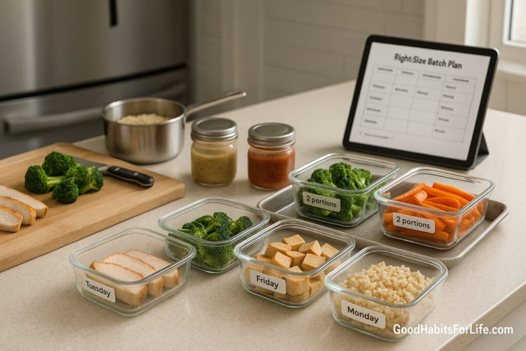 Right-size batch cooking means preparing small, intentional batches (2–6 servings) that fit a one- or two-person household without crowding your fridge/freezer or repeating the same meal all week. It blends: