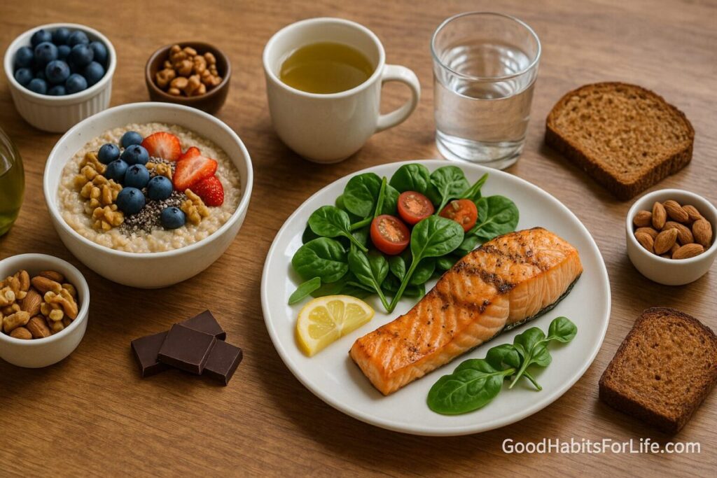 • Stock list: oats, brown rice, whole-grain bread; olive oil; mixed nuts; berries (fresh/frozen); leafy greens; eggs; beans/lentils; canned tuna/salmon/sardines; dark cocoa powder.