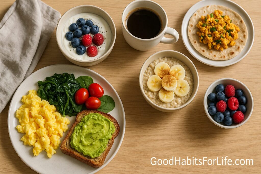 Protein (20–30 g): eggs, Greek yogurt, tofu, cottage cheese, lean meats, legumes, protein-fortified dairy/plant milks.