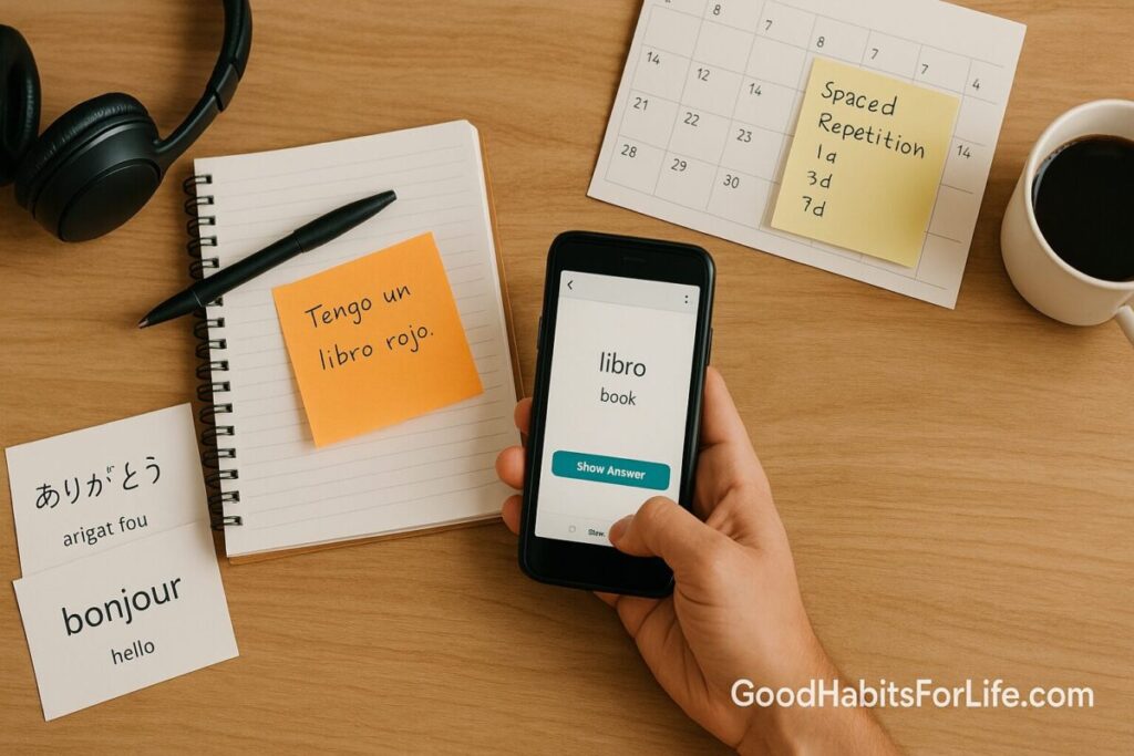 Languages are high-volume (thousands of words, forms, chunks). SRS keeps daily workload manageable while steadily increasing coverage. Well-designed cards also capture pronunciation, context, and collocations, not just “L1 ↔ L2” glosses. Evidence-based reviews of study techniques consistently rate practice testing and spaced practice among the highest-utility methods. SAGE Journals