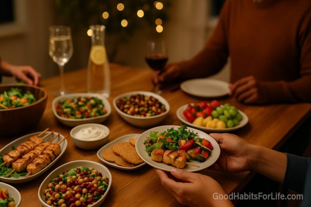 Pre-party snack, quick buffet survey, ½-plate veg, mindful eating, water between drinks, walk after.
