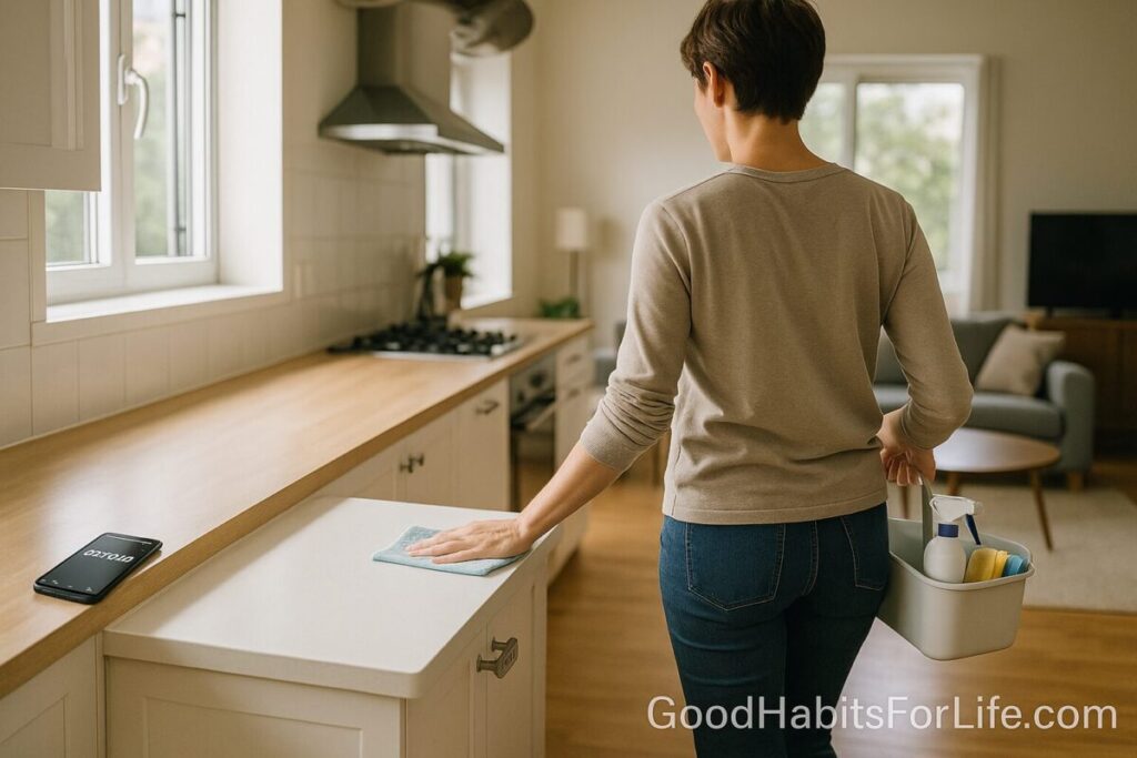 A cleaning circuit is a fixed, repeatable route through your home (or a single zone) with a short checklist of micro-tasks (e.g., clear, wipe, reset, quick vacuum). You move continuously, timer on, without stopping to ponder or reorganize the plan. The goal is consistency over perfection.