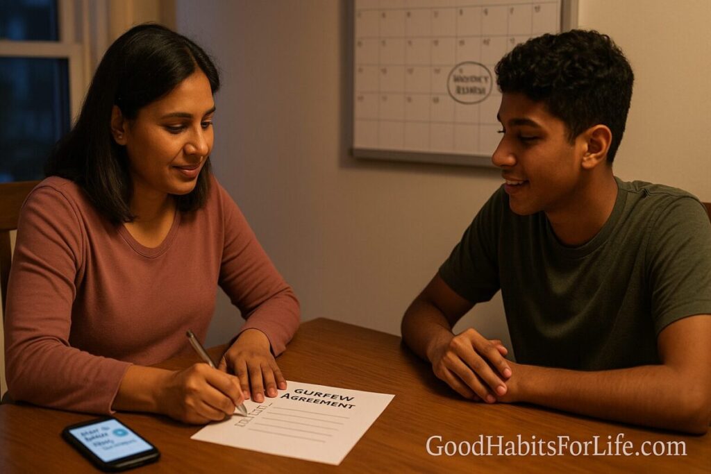 What: A written, shared curfew with simple check-in rules (time, place, plan, and contact method) plus a monthly review to adjust as teens grow.