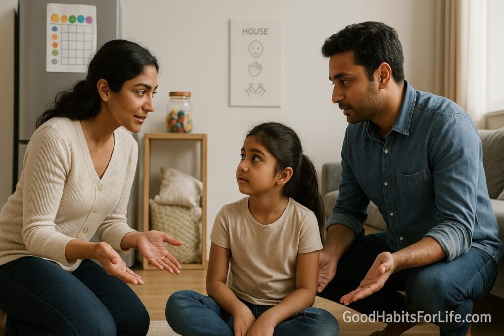 1. Pick 3 family rules (plain language): “Kind hands,” “Inside voice,” “Follow directions the first time.” Post them where kids can see. CDC