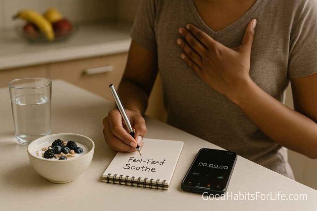 “This is an urge, not an emergency. Start 10-minute timer, breathe 4-6. If still hungry at 3+, I’ll eat a boiled egg + fruit and stop at 6/10.”