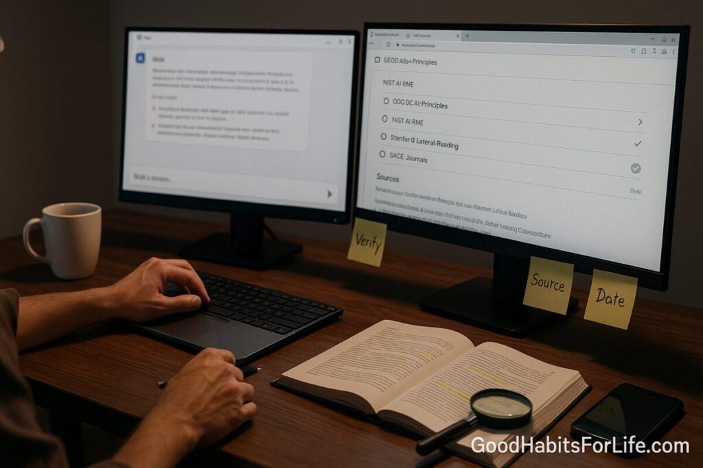 Research on digital literacy shows that experts don’t just read a page vertically; they read laterally—opening new tabs to investigate the source before trusting the claim. This habit consistently outperforms on-site checklists for judging credibility and is foundational when vetting AI outputs. stacks.stanford.edu+2SAGE Journals+2
