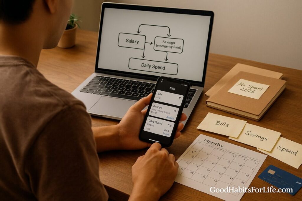 What it is: A simple, automated system for your first salary that funnels money into the right buckets—bills, savings, and daily spending—with minimal manual effort.