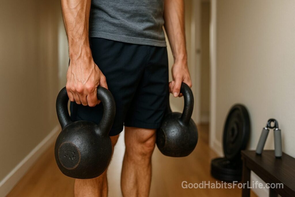 Increase time under tension by 5–10 s per set or add 2–5 kg to carries once sets feel solid.