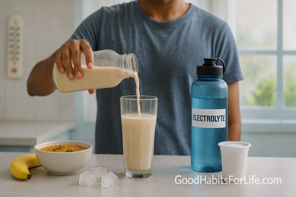 Why “protein-forward”? Protein-containing foods and drinks (e.g., milk, yogurt, lentils/dal, eggs, tofu) contribute electrolytes and nutrients that slow gastric emptying, aid fluid retention, and support muscle when appetite dips in heat. Controlled trials show milk and some protein-electrolyte beverages retain fluids better than water after sweating, and beverage-hydration research consistently finds electrolyte (especially sodium) and macronutrients improve fluid balance. Cambridge University Press & Assessment+1PubMed
