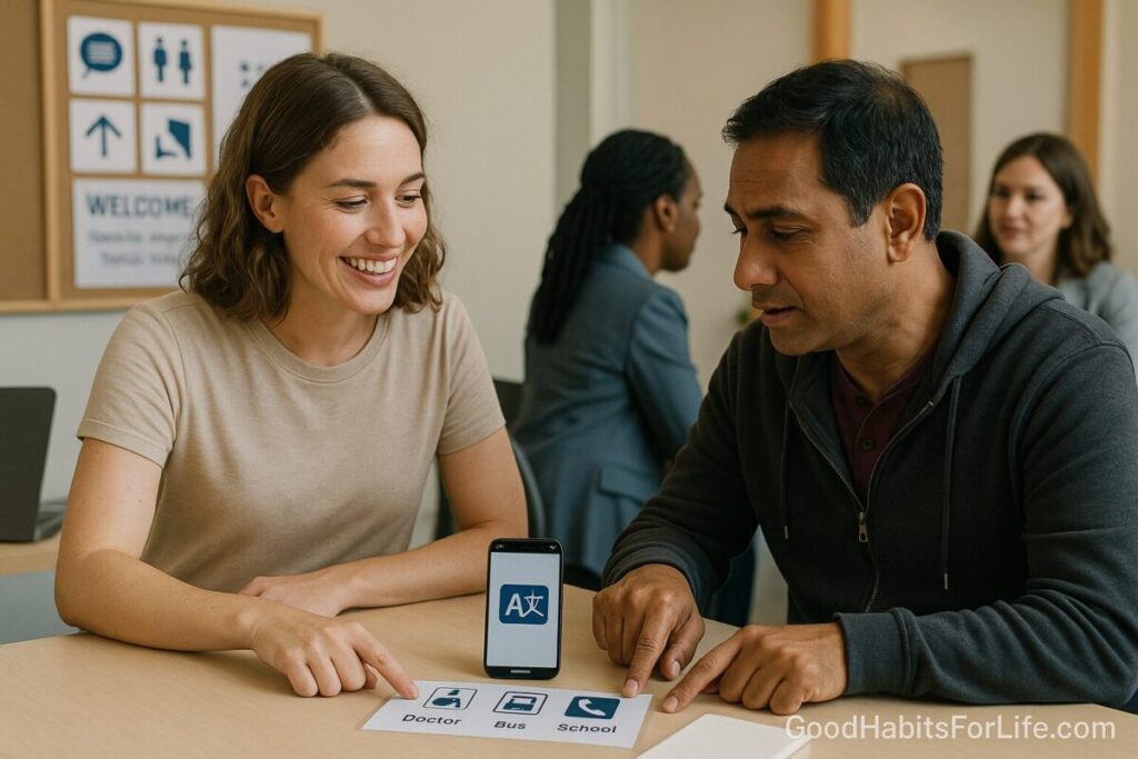 | Language ID charts / pictoboards | Identifying languages, basics | Quick discovery, visual support | Not a substitute for interpreters in complex topics GOV.UK |