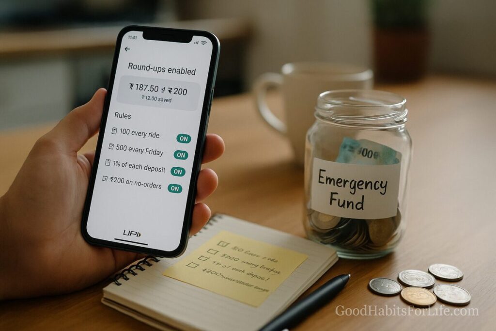 • Rules: Fixed, easy triggers—“₹100 every ride,” “₹500 every Friday,” “1% of each deposit,” or “₹200 on days I don’t order in.”