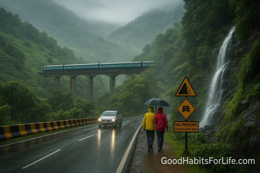 Rail beats road in sustained rain, especially on ghat and hill sections. If you must drive, stick to daylight, national highways, and turn back on first signs of waterlogging, rockfall, or poor visibility.