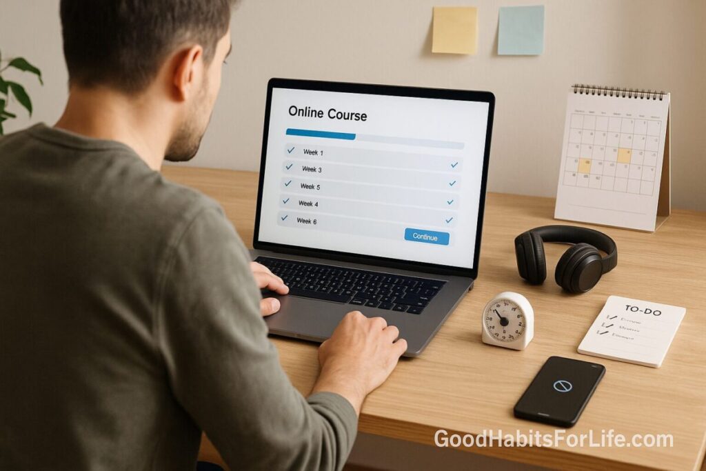 Implementation Intentions (If-Then Plans): tie a context cue to a specific action (e.g., If it’s 6:30 a.m., then I open the MOOC dashboard and resume Lesson 4). These reliably improve goal attainment. PMC