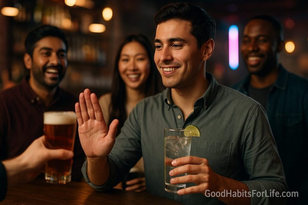 One short line with a smile: “I’m not drinking tonight—sparkling water, please.” Then pivot to connection (“How was your week?”).