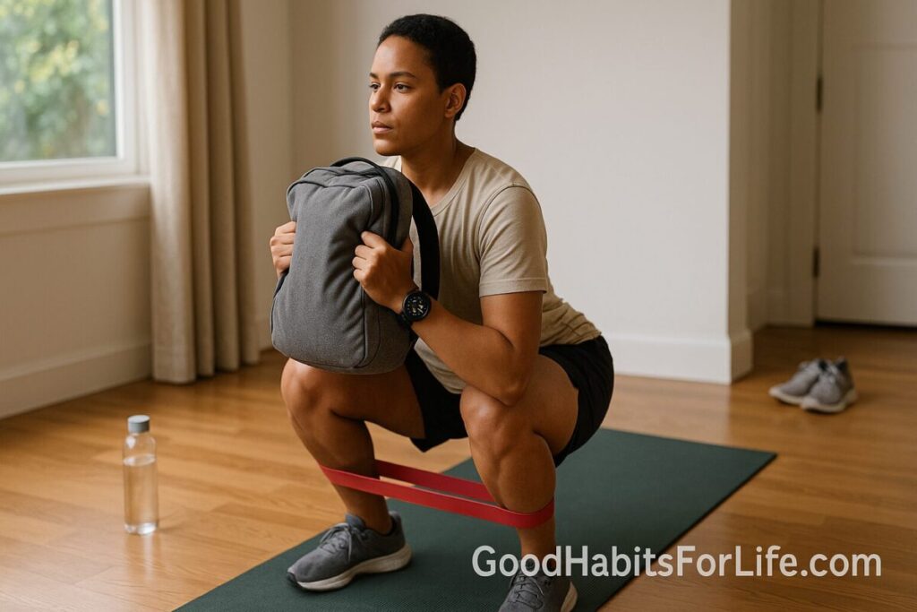 • Add band-assisted pull-ups (door bar optional), backpack thrusters, hip hinge with 2-second pause, carries up to 2–3 min.