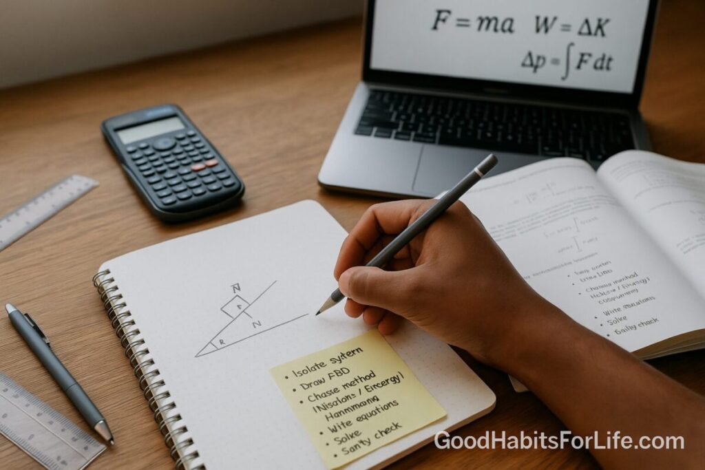 Students (AP/Intro Uni): Drive the habit of “System → FBD → Method.” Keep a one-page template sheet taped inside your notebook.
