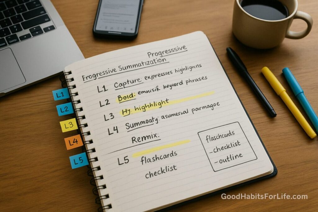 Progressive summarization (PS) is a note-layering method popularized by Tiago Forte. You capture once, then distill the same note in small, opportunistic passes so the most meaningful parts become instantly “glanceable.” The classic five layers: