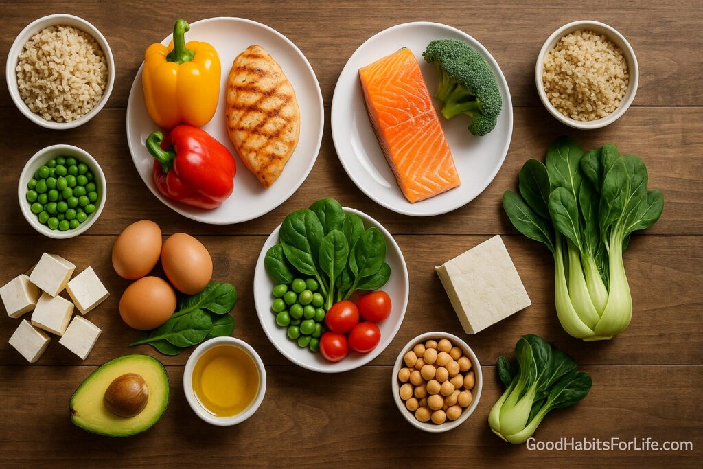 Goal: 2–3 balanced meals/day built from protein + produce pairs.