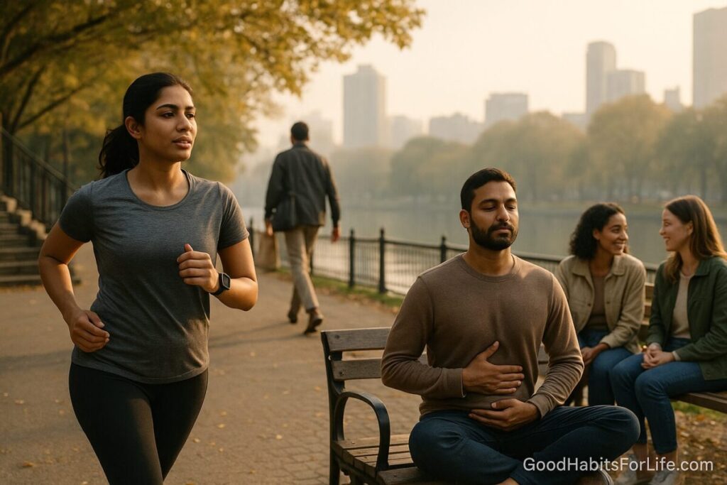 Why for stress: Frequent light movement limits the “all-day sit” stress load and supports metabolic health; differences in NEAT can exceed hundreds to ~2,000 kcal/day between people. PubMed