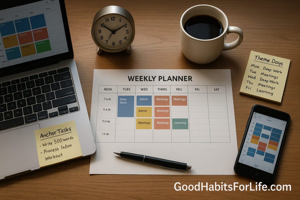 Weekly planning ritual (30–45 min): pick weekly theme(s), define 3–5 outcomes, pre-block calendar.