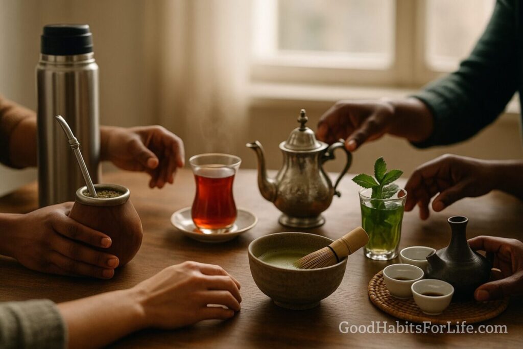 Week 1: Yerba maté (gourd & bombilla). Week 2: Turkish çay (tulip glass). Week 3: Moroccan mint tea (sweet & fragrant). Week 4: Matcha (whisked). Week 5 (if any): Ethiopian coffee (slow & communal). Cultural notes below. Encyclopedia Britannica+1